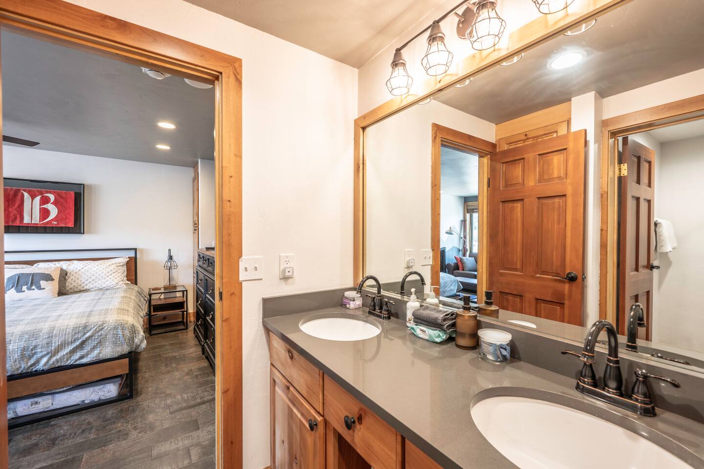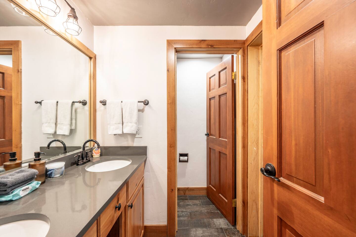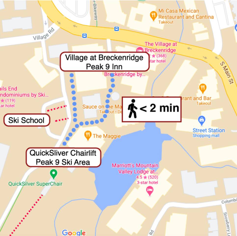 The Village at Breckenridge is located at the base of Peak 9 and the Quicksilver lift. One side of the building backs up directly to the Quicksilver Lift, Breckenridge Ski/ Snowboard School, Breckenridge Sports Rentals, the season pass/lift ticket office, Urgent Care, and Maggie Pond. The other side is one block from Main Street where most restaurants and shopping are available. The Village has a massive courtyard that hosts many events such as the art festivals, beer festivals, wine festivals, farmers market and more! We are steps from the Blue River recreation path, which will take you to the Blue River for fly fishing, bike ride or a picnic. You can continue along the path to the Breckenridge auditorium for live music and events, restaurants and shopping, and all the way to Frisco if you like!
